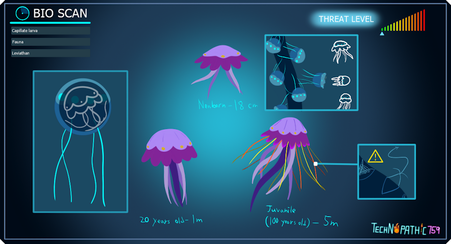 They reaches the juvenile stage after appropriately 100 years after hatching. At this stage they truly begin to resemble their parents: Having begun to develop the colors. With the stinging tentacles developed, they will begin to drift away to open seas in order to hunt, while still feed on zooplanktons. While they can sting, it's not lethal. They reach maturity at 200 years.
