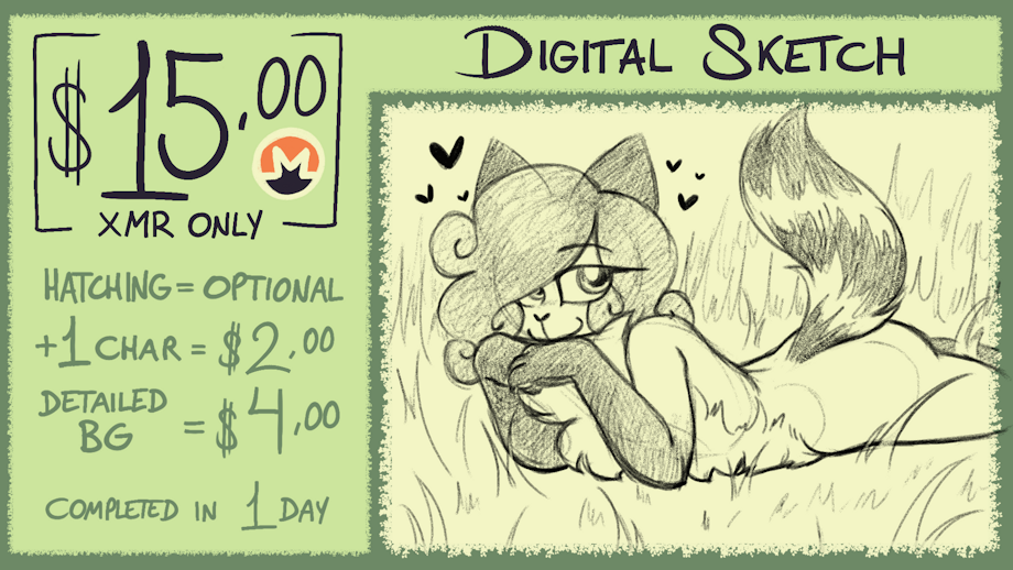 Once your commission is accepted, you'll receive a Monero address and a rough estimate of when I'll start working on it and when it could be finished. I'll update you every step of the way, and adjust anything at your request. If you chose to pay half-for-half, you'll receive a second address for paying after the sketch is done. Then, when all is finished, I'll send you the product in full resolution (.png and, in certain cases, .kra) before posting.