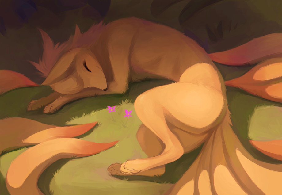 Some more lineless painty stuff! This one went very smoothly, and I quite like the result - especially the gesture, hehe. Spent a while on the alternative versions too, which should be up pretty shortly! Arranging all the tails to work with the composition was quite nice - if only all foxes had tails...