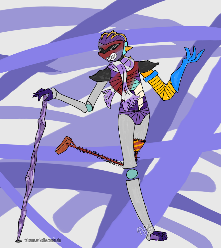 You see a tall construct of some sort stride into the room, lanky legs lending to more of a jaunt than a walk. The first thing you notice is the mismatched limbs; while her right arm and leg seem uniform to each other and match her aesthetic, her left arm is something akin to a snakelike appendage with a gauntlet, and her left leg is thin, gray and covered in wires. Three small buzzsaws adorn her scalp like cornrows, and red paint has been smeared across her face and chest. However, despite the extensive modifications, you can't help but notice how immaculately clean she is.