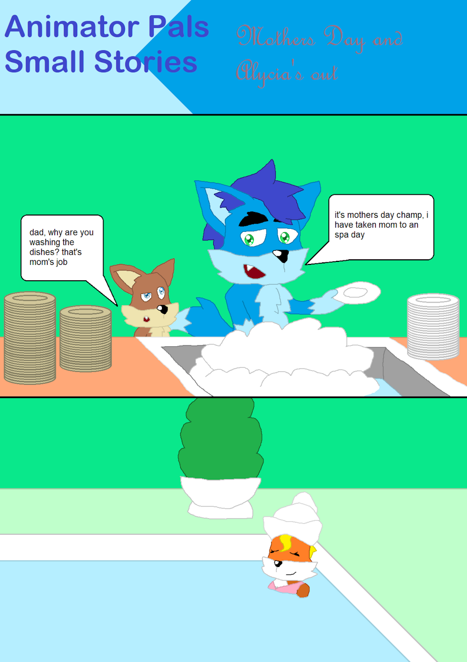 Alycia needed a day off during mothers day cuz taking care of two fox twins and an adventurer wolfdad gave much work for her so she tells Anton to wash the dishes when she's having an spa day on mothers day.