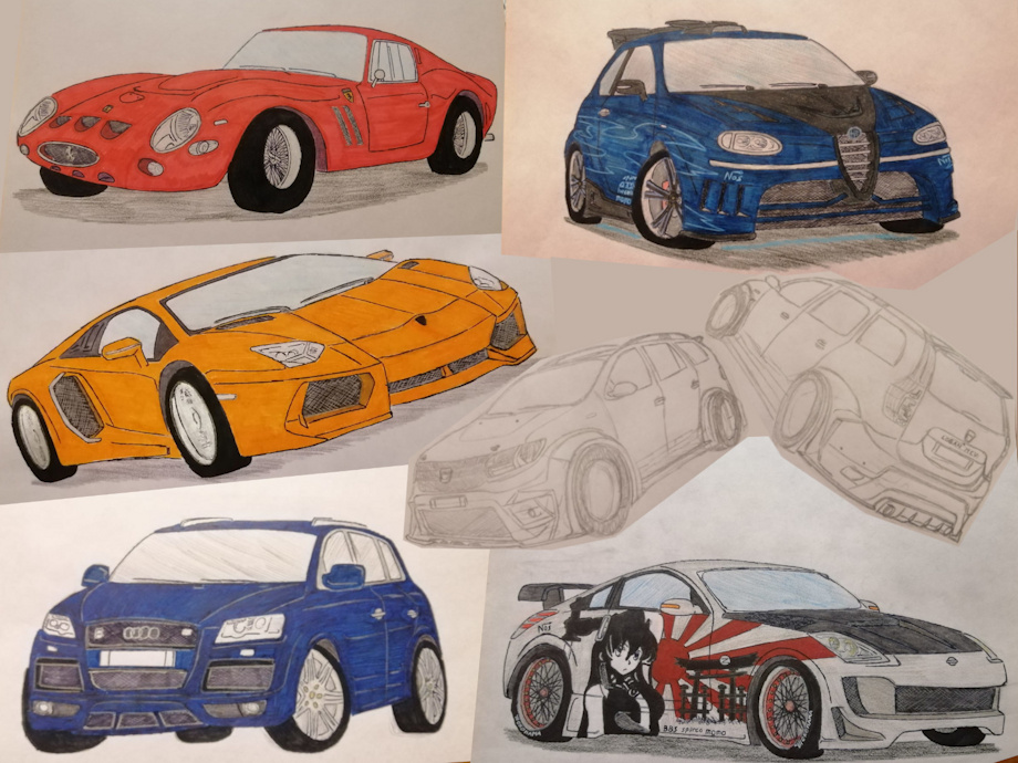Thank you. The "red one" is a Ferrari 250 GTO. Under we have a Lamborghini Aventador and an Audi Q7. Right side we have a Tuned Alfa Romeo 147 GTA; a double sketch of a custom tuned Dacia Logan MCV...and an "Itasha Style" Nissan 350Z