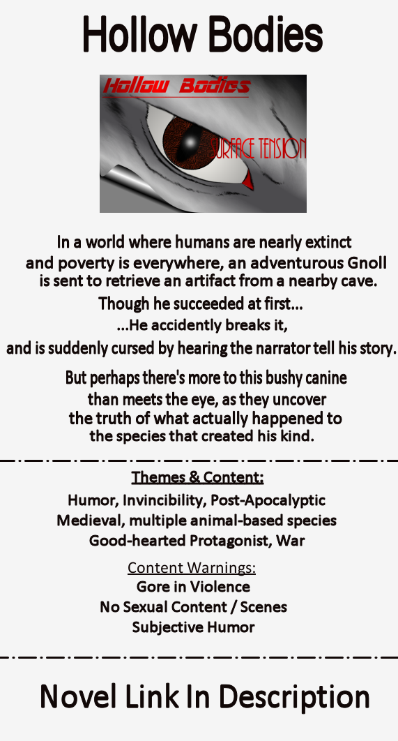 Anyway, you'll probably like this novel if you enjoy: +Adventure +4th Wall humor +Good-hearted protagonist +No-yiff/sex stories, but with a little bit of adult content here and there. +"Cartoon" silliness (you'll see what I mean maybe 1/4th in the first act) +Action +Medieval Fantasy Worlds +Mystery, borderline horror +War +Violence/Conflict