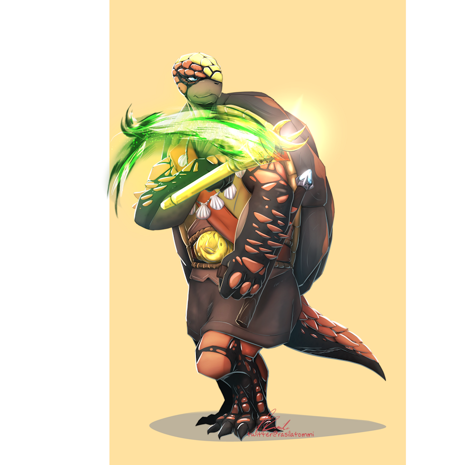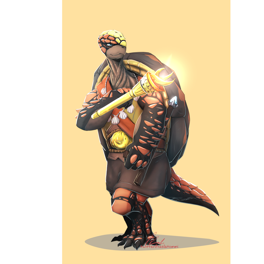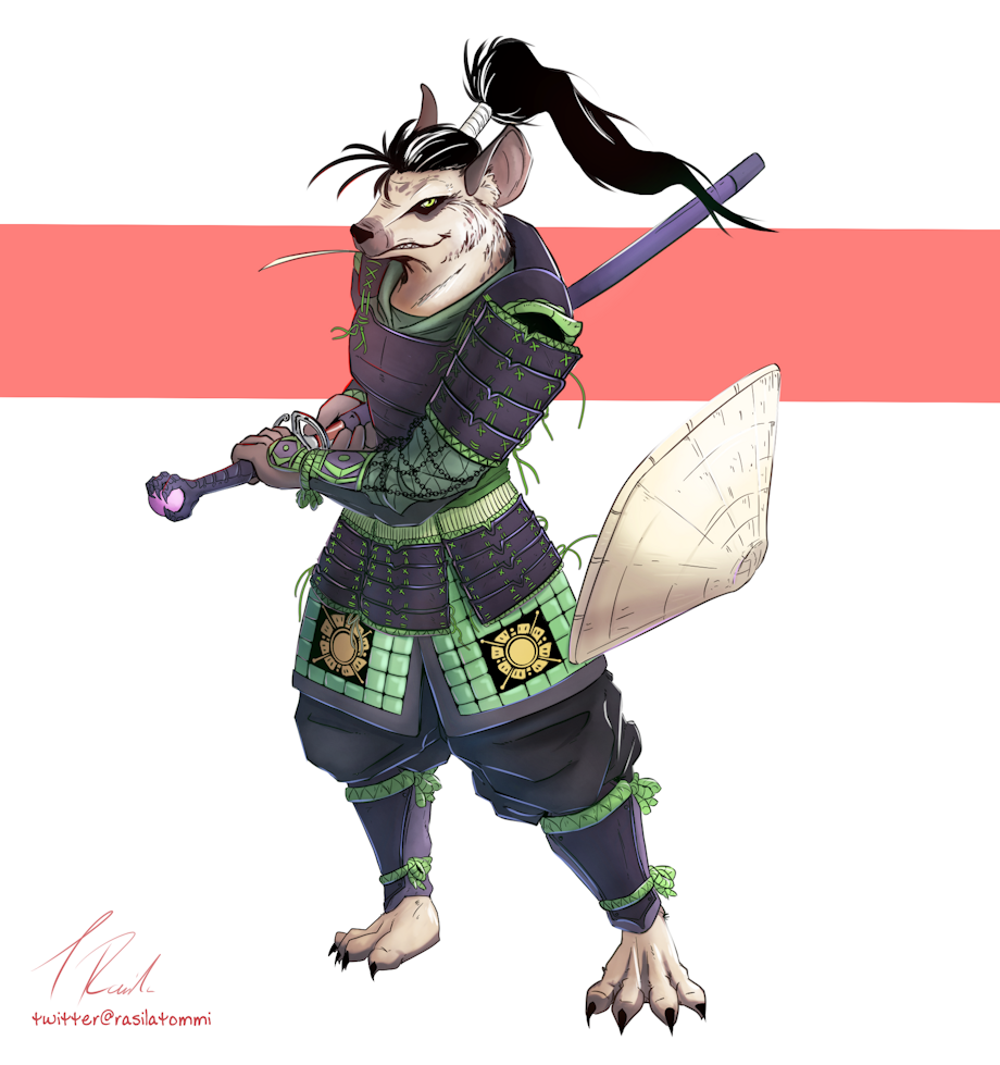 Lawfully good by nature, he acquired a Lightbringer mace from a deceased cleric's trial and had it re-fashioned into a Tonfa fitting his fighting style just like his Arcane focus.