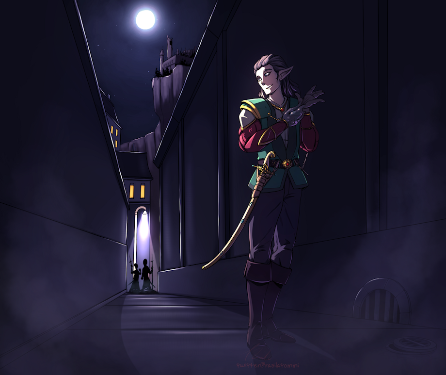 He's an accomplished Athlete taught by an elven teacher the renowned art of elven Bladesinging. Always looking for another place to challenge others to a contest of athletics or battle, he now travels the lands with a ragtag group of adventurers including a Goliath named Gila who enjoys using him as a projectile.