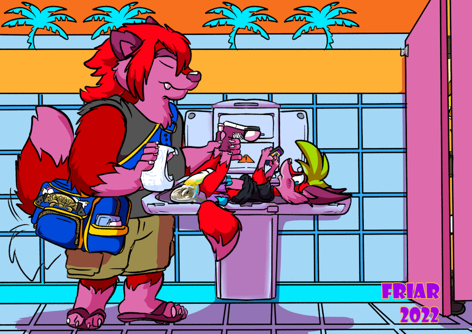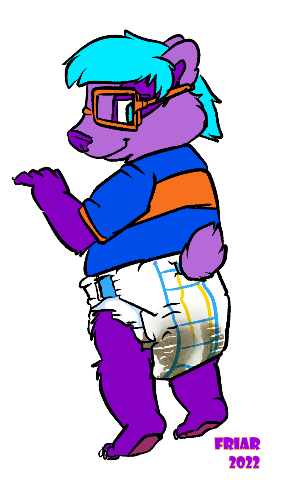 Everett, posed by the window, has filled his diaper in the treehouse. He stands upon one of Friar's old training potties, surrounded by records, a bass guitar, and a music poster. Out in the distance, the waters of Woodville Bay can be seen.