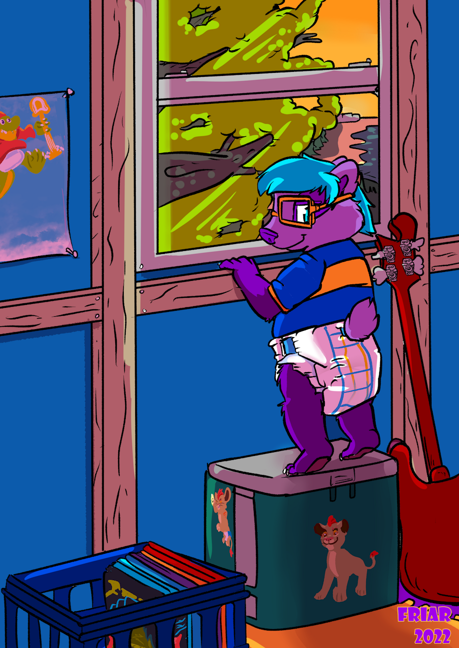 Everett, posed by the window, has filled his diaper in the treehouse. He stands upon one of Friar's old training potties, surrounded by records, a bass guitar, and a music poster. Out in the distance, the waters of Woodville Bay can be seen.