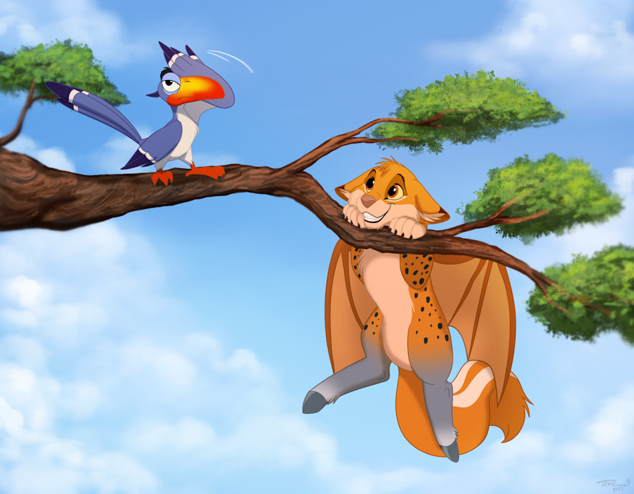 Despite Zazu's warning against it, Simba went and got himself turned into a chimera. I can't tell if he's annoyed that Simba ignored him or if he's embarrassed by Simba's lack of flying skills.