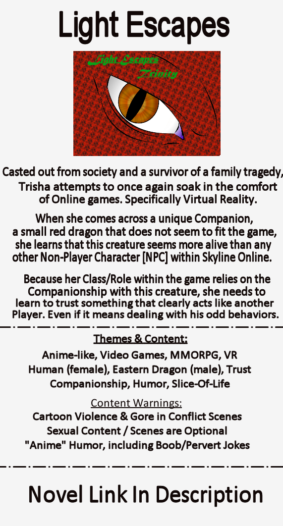 That being said, if you do read some of the older descriptions I wrote of these acts and notice it mentioning a certain anime; SAO, keep in mind that wording is important. If you don't like SAO, Light Escapes has nothing to do with it. At all. I just took inspiration of the concept of VR and a MMORPG, and basing the setting around that. I'm not claiming that SAO did this first out of all the animes out there, it was just the one I seen that inspired me to write.