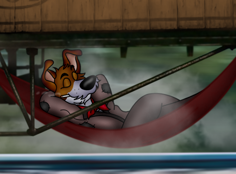 The rails thundered below in a blur of motion. The hard iron moving like a raging torrent that threatened to suck anything that it touched underneath the freight train. Yet for all it's motion, all the smoke, dust, and clatter of wheels, none of it seemed to bother the Jack Russel terrier that had hung his hammock up between the truss-rods of the boxcar. Dodger closed his eyes, and drew in his cigarette. Swaying in time to the train's motion.