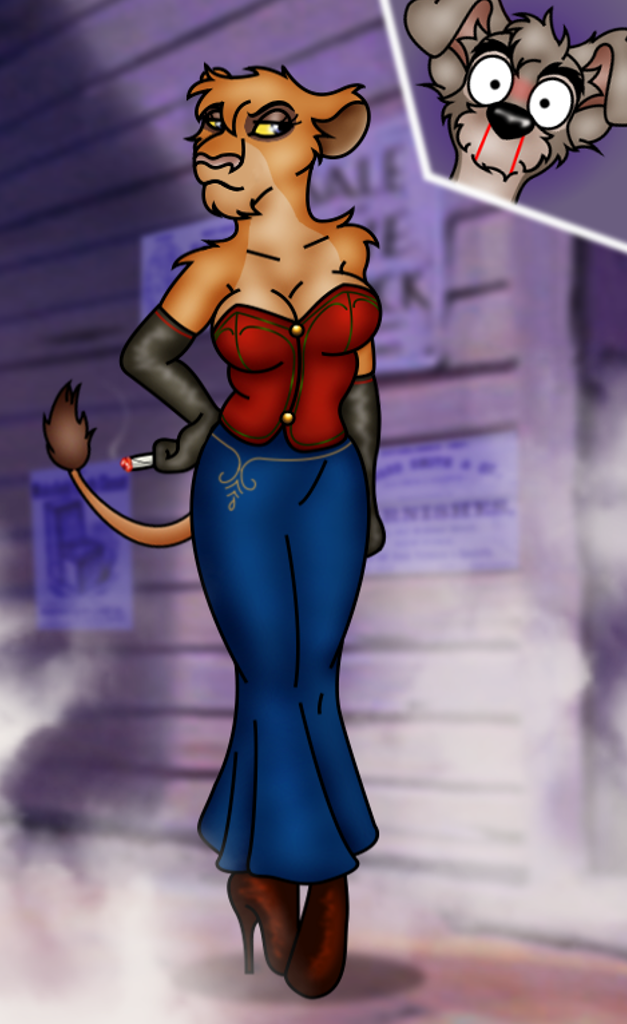 To that extent, Vitani held her head high and stepped out of the alleyway onto the sidewalk. She cocked her head to the side and gave a low growl. “Hello, Scamp. Heh, fancy seeing you here…”