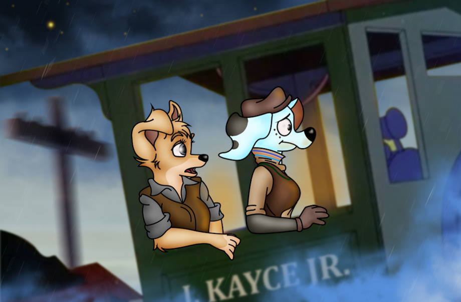 Knowing that they would need to start slowing down for a sharp curve ahead just before the downgrade dipped sharply, the dalmatian turned her attention to the brass handle, where she began to squeeze on the brakes. At first, nothing seemed to happen. Just a very slow wheeze of air. The train's speed barely changed. Ice on the shoes and rigging were no doubt decreasing its effectiveness. Promptly, Dolly wound the brake on more. It took a little extra time for the frost stiffened air valves under each car to loosen up and for the friction of wheel and brake-shoe to burn off the ice and moisture. The slack rolled out as the couplings went taught, and the train slowed somewhat belatedly.
