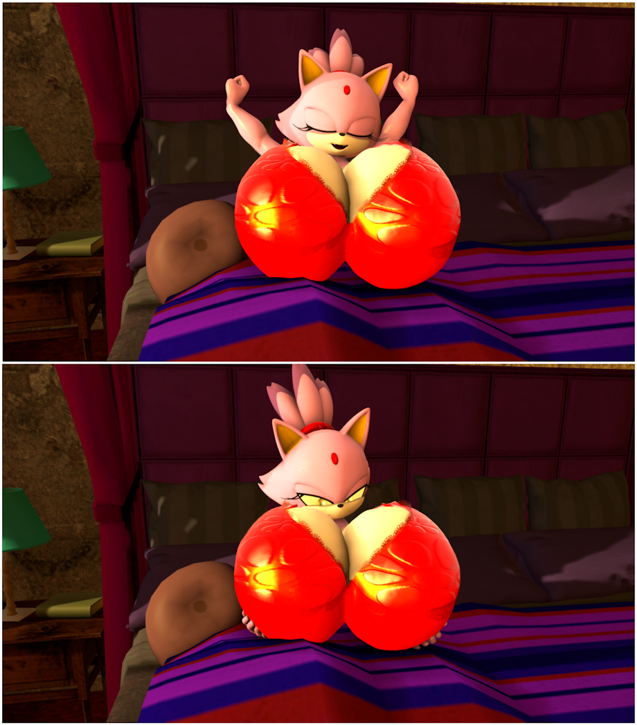 As the sunrise signaled the dawn of a new day, Princess Blaze of the Sol Dimension, guardian of the Sol Emeralds, awoke with a satisfying stretch and a yawn as the sun shined through her castle bedroom window. And as she opened her eyes, she looked down with a smile, hefting her evergrowing chest in her hands. "Good morning girls, did some growing again last night? Good job."