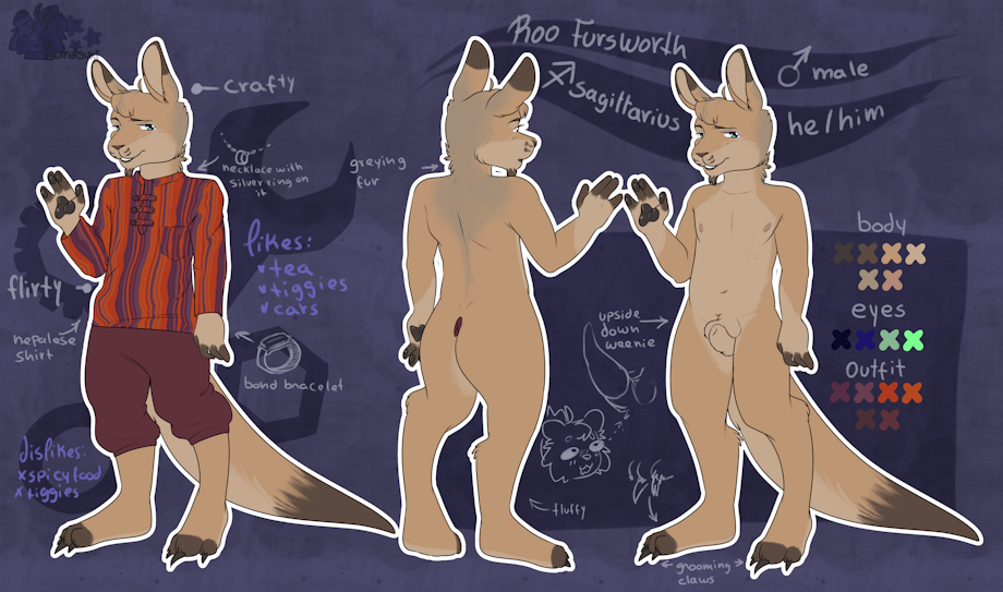 I do like the extra detail of his ballsack hanging above his penis - most marsupial furries seem to decide that's too weird and opt out of it.