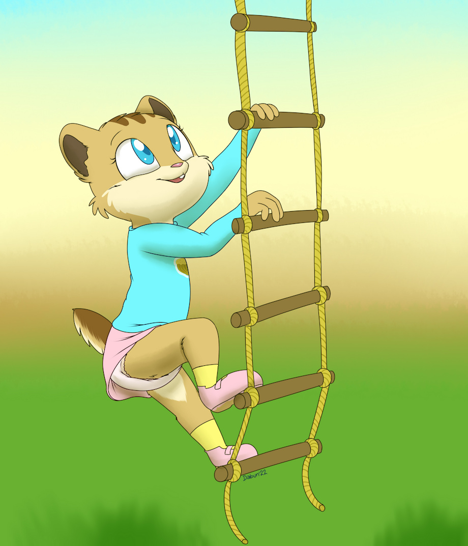 Petal chipmunk climbing up the rope ladder to her treehouse.