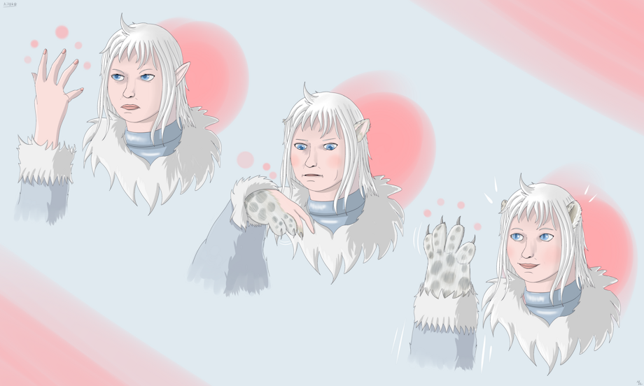 Ailaka, elvish druid, practices her snow leopard wild shape, but just the paws. She mostly succeeds.
