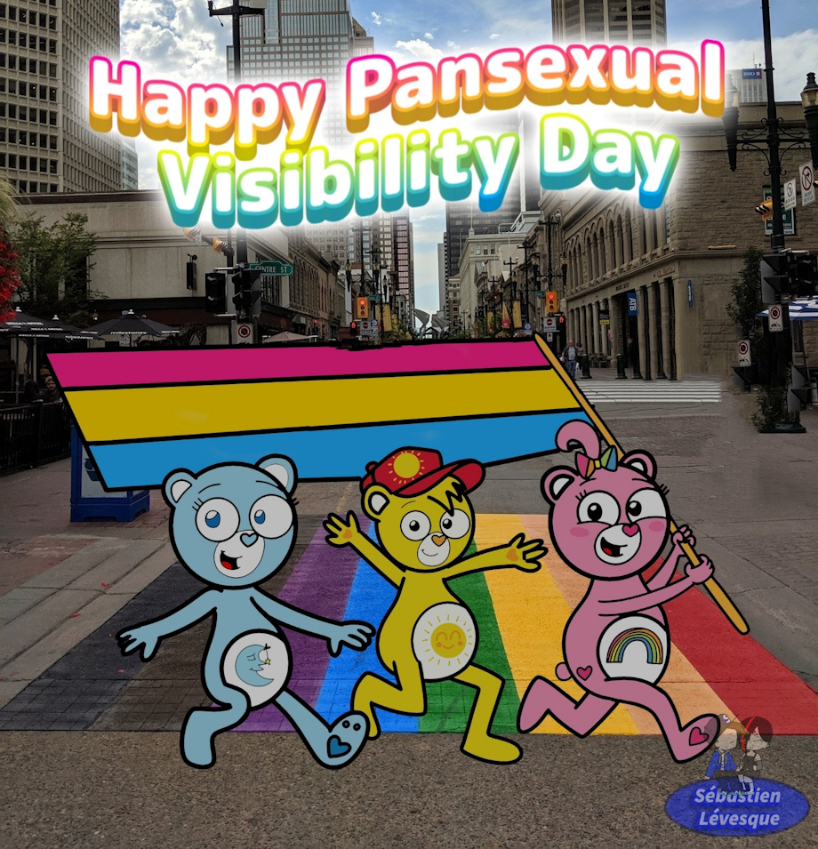 Today is National Pansexual Visibility Day. So to celebrate, I decided to draw three cuddly bears running together and Cheer Bear carrying the pansexual flag down a Calgary street. All in my style.