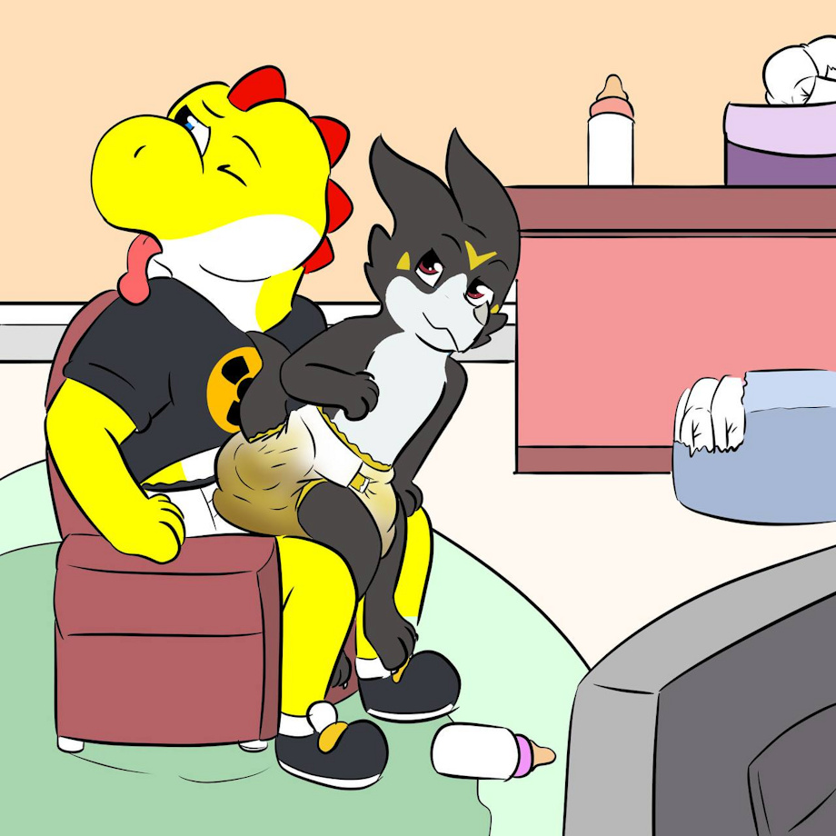 Vee being a stinky, messy digi on Show's lap, getting even stinkier, even for the yosh.