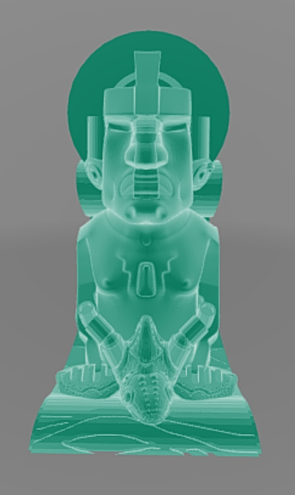 A green robotic bust with stuff missing in certain areas and cylindrical ears, sunken eyes, and other features that make them not quite human, and they have a steampunk robotic fish intersecting with them that adds to the surrealness, and they sit on a wave that serves as a relaxing chair of sorts. A very complicated character.