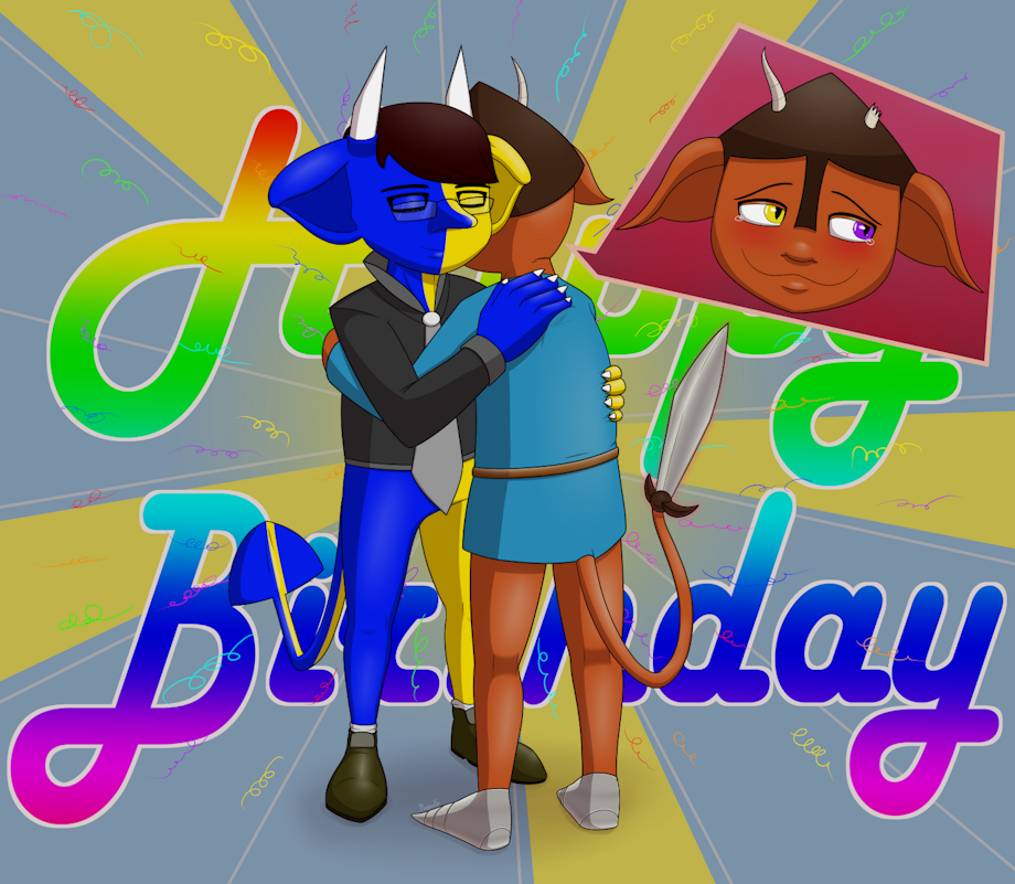 for their upcoming birthday. It features one of my imps (Kamillo, left) hugging their imp OC.
