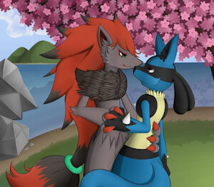 Cover: Lucario (Luke) and Zoroark (June) hold each other's paws while romantically touching each other's foreheads. The background is daytime in a beautiful field.