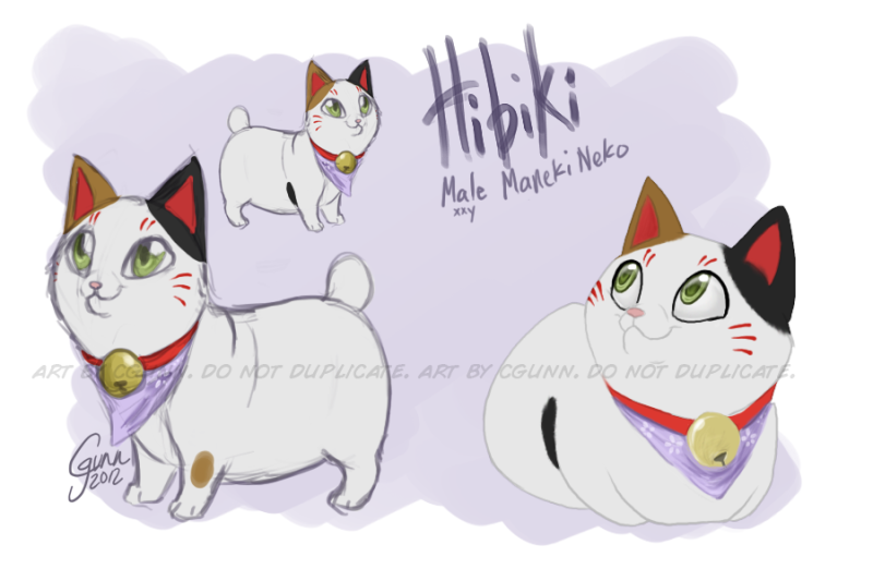 Hibiki is my male Maneki-neko character. Yes he's male and he's a calico. He's got an extra X chromosome which makes him awesome and also sterile. xD So no bebbehs for him. However, he's super lucky and adorable. I have a million sketches of him and none of them are online. woops. LOL. But here's his ref!