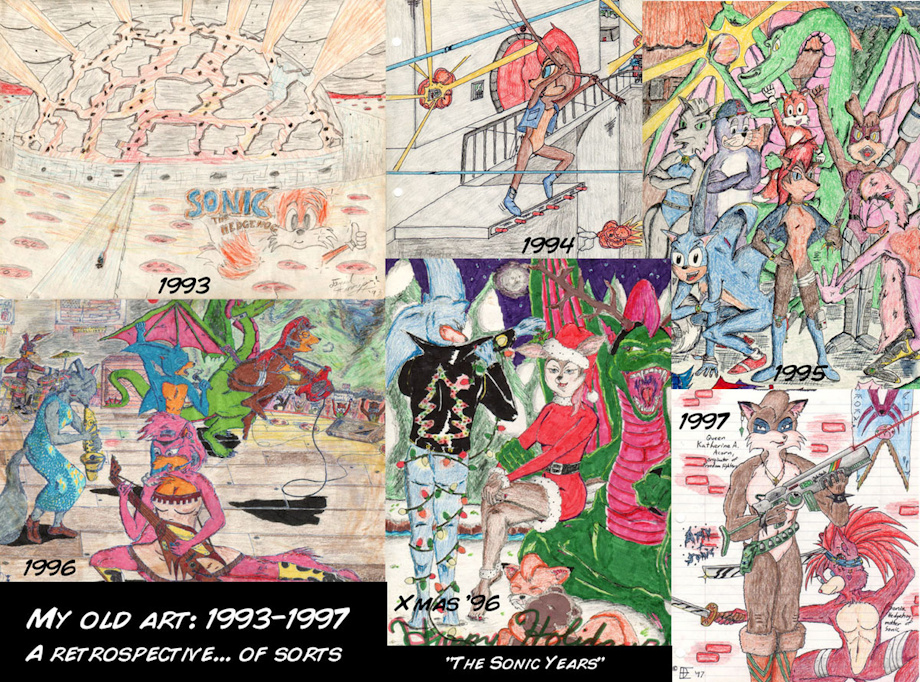 You asked for it. Here's a six-picture collage of the OLDEST and dankest crap I still have on file, starting from 1993. I had JUST started watching the Sonic the Hedgehog SatAM cartoon, and had just turned 13. My art steadily improved(?) over the 1990s as I searched for a style to call my own. Back in the 1990s, Sonic was almost a religion to me. Each piece I drew, even though they were total shit, was like an act of devotion, and I really did think what I was doing was special. This was pre-internet, so I had no contact at all with the fanbase or context for anything I drew.