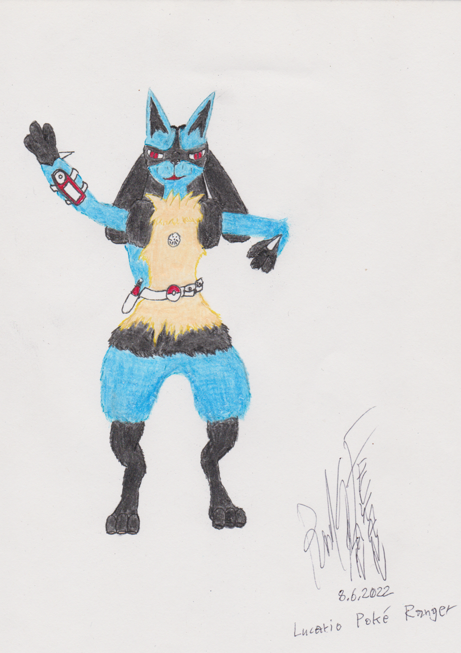 As I got a fursuite from a new aquaintence of mine, fur a con, I made this picture to specify the cosplay...as a Lucario that also is a Pokémon Ranger.