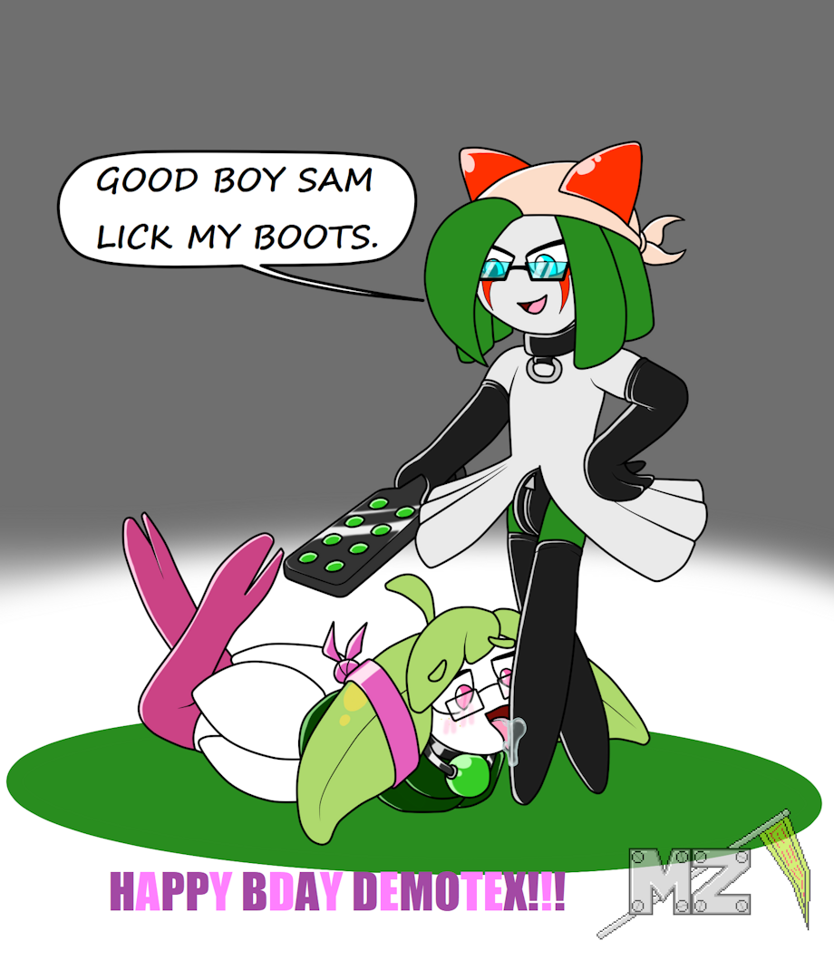 of there male Steenee OC Sam bound in a straitjacket and licking Kirlia Zaki's boots like a good slave.
