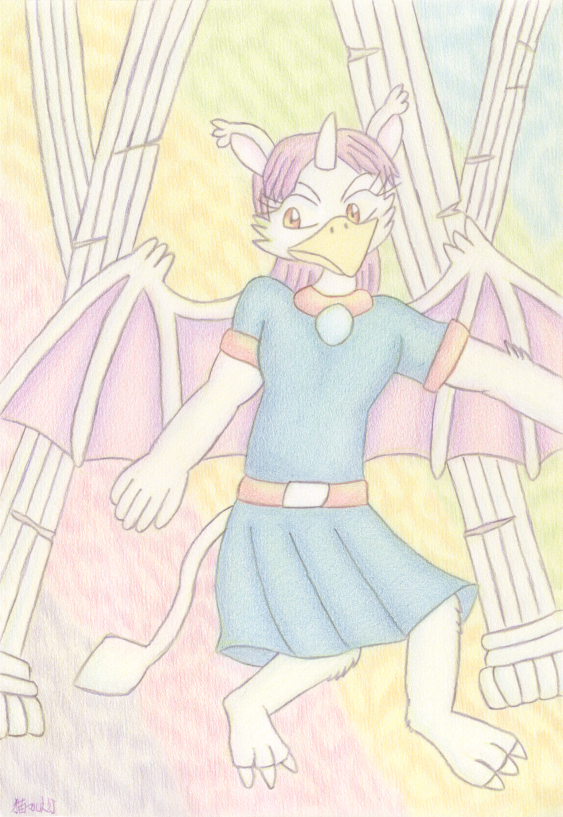 I draw my bat boy character Kuraresu with green forest background and I draw this art in 2020. first I sketch this character and I feel his pose is really attractive so I try to draw the rock under his hands and his motion become more vivid, and I draw stepping stones and grasses, and the wooden fence and green leaves in distant, I love this green nature.