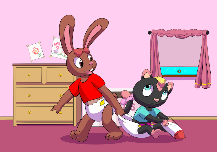 showing his OC, Amy Bunny, dragging :@babykittysierra's OC by her diaper.