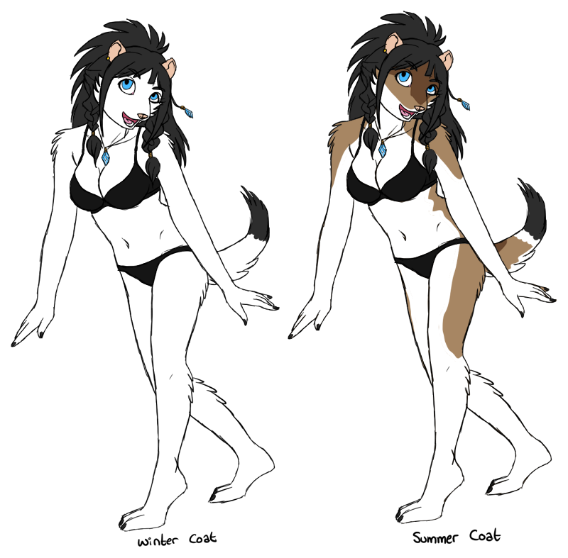 Female ermine, displaying her winter and summer coats, up for adoption. She costs $10 and purchasing her will entitle you to $5 off of a regular/pinup style commission of her within 3 months of adoption date.