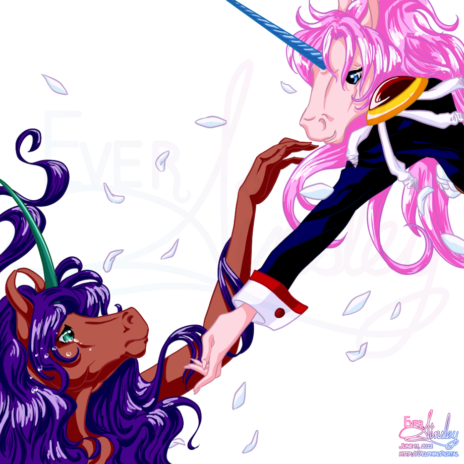 Look, I am Utena trash. I couldn't think of what the fuck to do, until lav3nd33r was like "hear me out: Utena Unicorn." I have been WANTING to do some SKU/RGU reference-ish art, and while I'm still gonna do something else but I've been wanting to use like... this scene in some kind of re-draw art. So, yeah, re-draw of official art of Utena and Anthy!corns.
