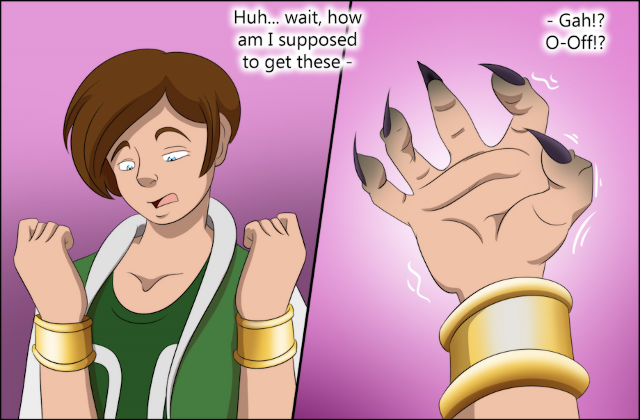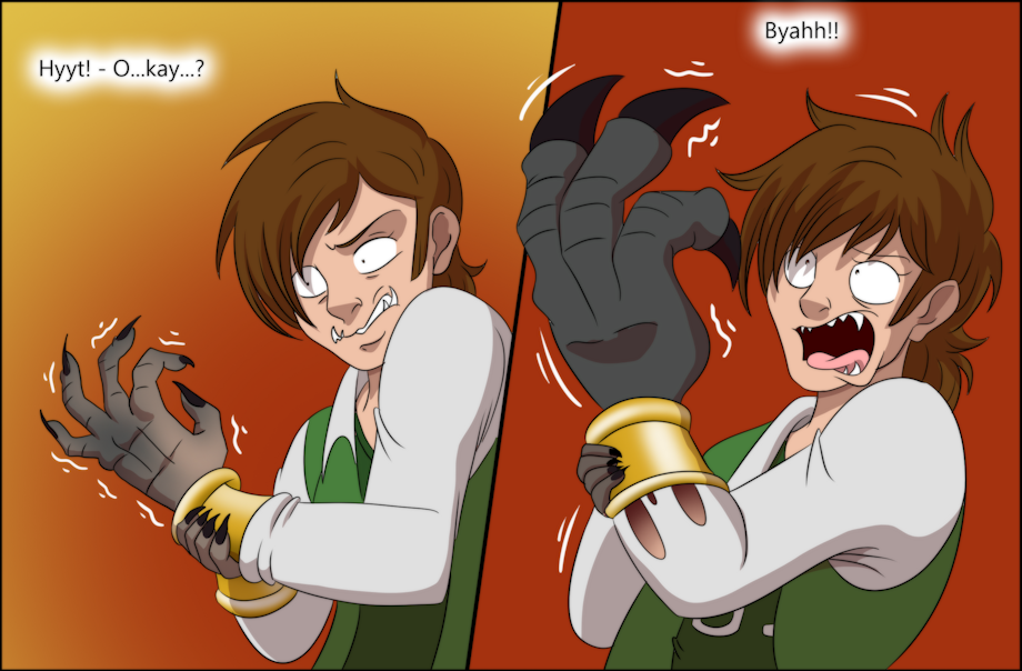 Lana apparently thinks I need more bling because she gave me some fancy golden bracers, which she put on my wrists herself...but I couldn't see any way to take them off...I soon found other things to worry about as my hands started shifting and growing black claws!