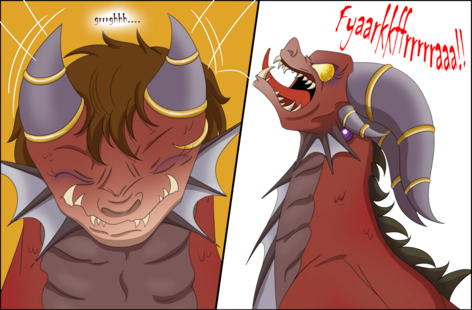 I let out a guttural growl as my neck extended further and my face pushed outward into a muzzle, while large purple horns grew out of my head!