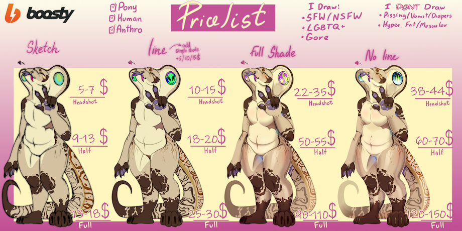 For further information, there will be other images with visual examples, but for now I will indicate everything here: ► Excessive detailing of the character (A huge number of accessories, very complex patterns on wool / skin, a lot of tattoos (if they do not have a separate PNG file) requires an additional payment of 5 to 20$ ► Edits: The first three are free. Further - from $2 for a small one, up to $5 for a large one ► Backgrounds • Single color or gradient - free • Abstract (simplified) - from $10 to $30 • Full - from 40 to 100$ (All prices depend on complexity and detail) ► Additional objects • Additional character + 80% of the amount • Animal (pet) + 40% of the amount • Item - from free to $20 (depending on the object, if it's something light like a pencil, mug, phone, cigarette, etc., then you don't need to pay extra, but if it's some kind of mechanism or machine, then it already costs money ) (addition, sex toys are included in the free section if it is a small dildo or gag, but a full-fledged shibari or horse-sized toy or sex machine or something like that, it requires an additional payment, you can ask for all the details when ordering)