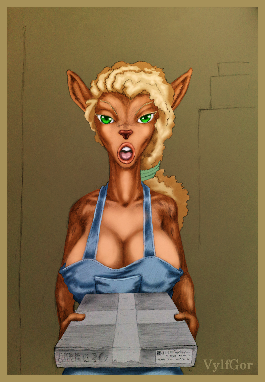 These human style small mouths on anthros just look odd to me. But great outfit, I love these jeans-skirt-overalls .