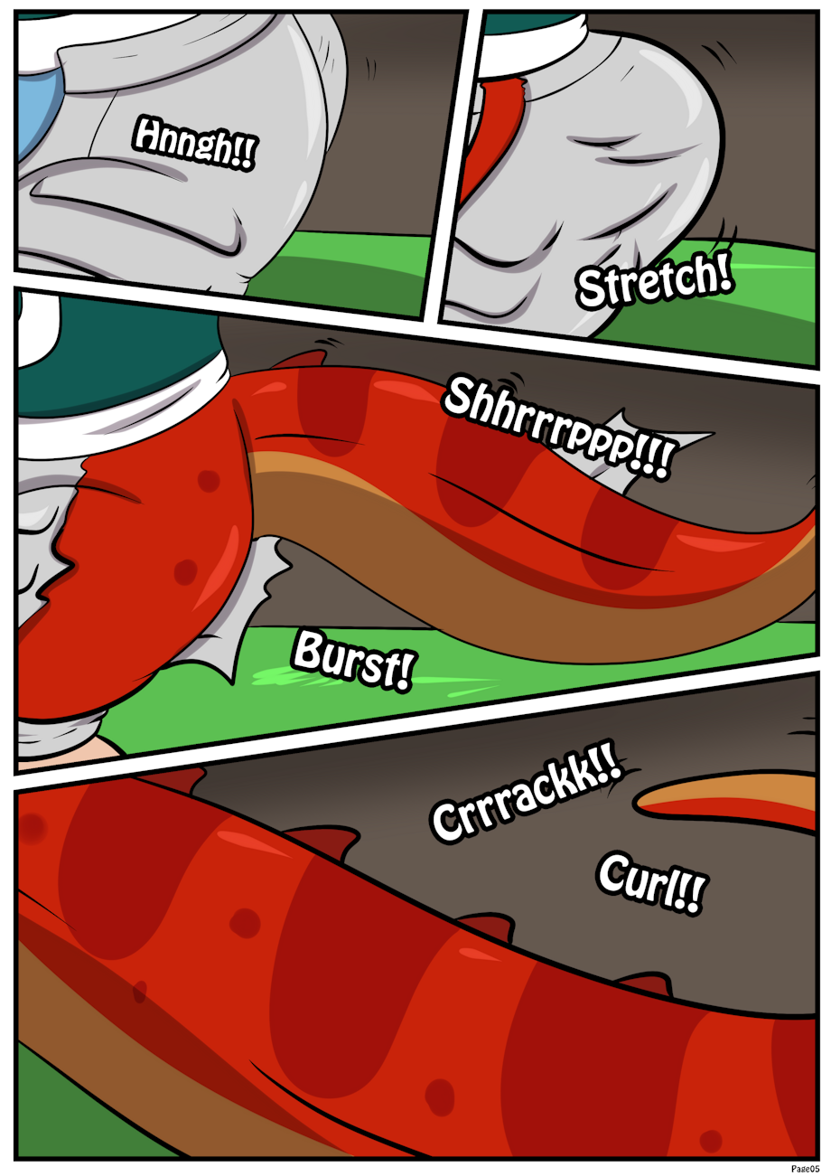 I grunted as my compression pants tightened, thanks to a new large appendage growing from my behind. My pants could hold no longer, and a large raptor's tail burst from them!