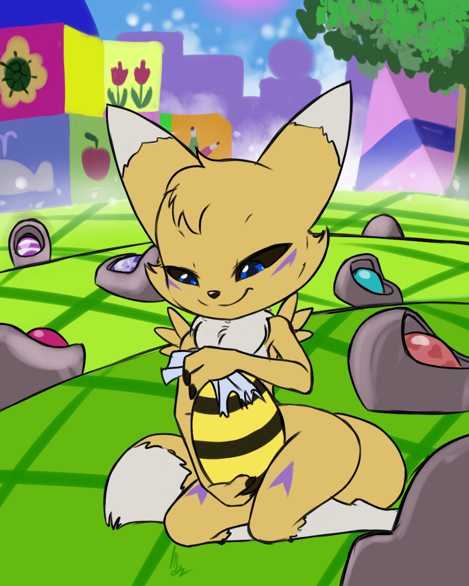 Stream commission for frostwolf300, of their Renimpmon tending to the eggies in Primarey Village.
