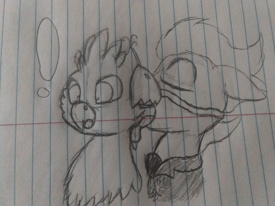 Gyro Feather getting licked by Lightning Flash, who's wearing a gryphon costume.