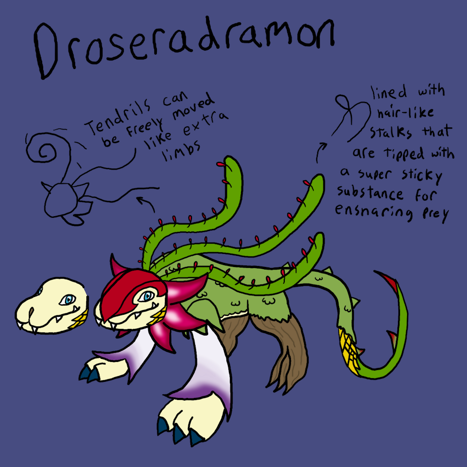 finally actually drew somethin, its a concept for a digimon i had, the plan was its a champion that floramon digivolves to then this digivolves to toropiamon but this design doesnt look dragon-like at all. i still love this though so i stuck with this instead of tryin to make it more dragon, worst case scenario it at least works as a potential champion for floramon still and if toropiamon isnt a believable ultimate then maybe it could digivolve into somethin like petaldramon.