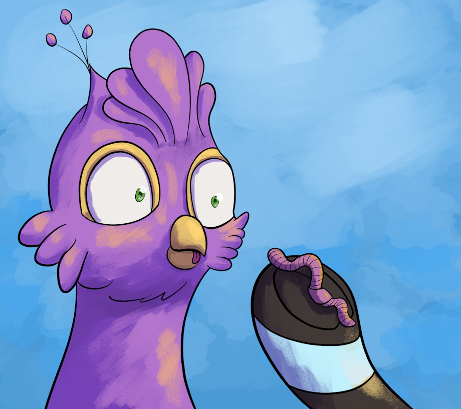 Gyro Feather is offered a worm.