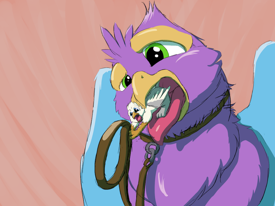 Gyro Feather is about to devour his master.