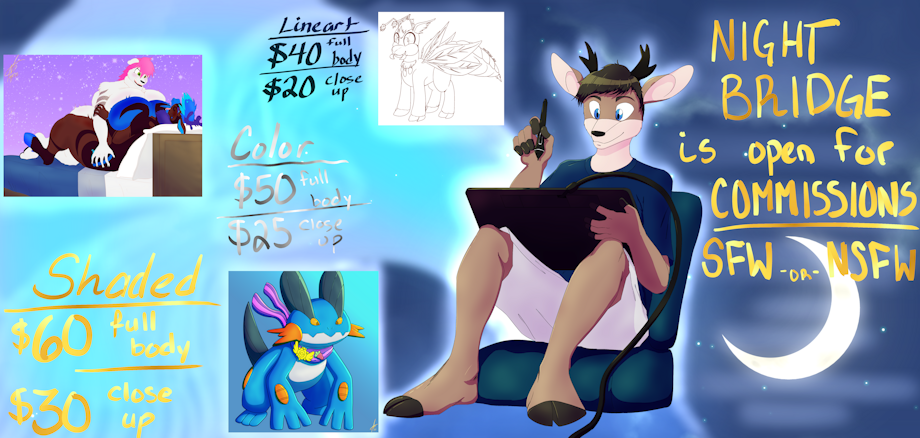 Hello everyone! I'd like to announce that I am open for commissions! Main prices shown above! Prices stack with multiple characters! Additional prices: