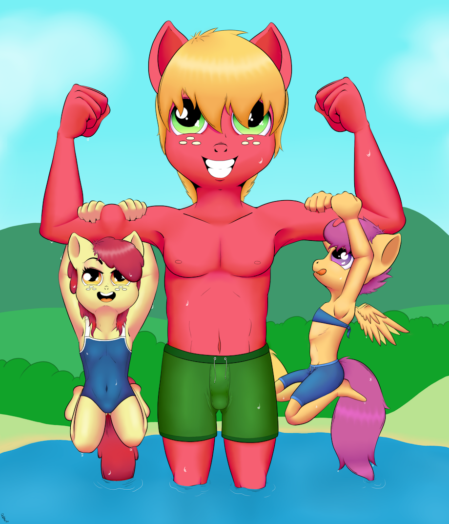 With new swimsuits in hand Scootaloo and Applebloom head to the lake to cool off, dragging Big Mac along.