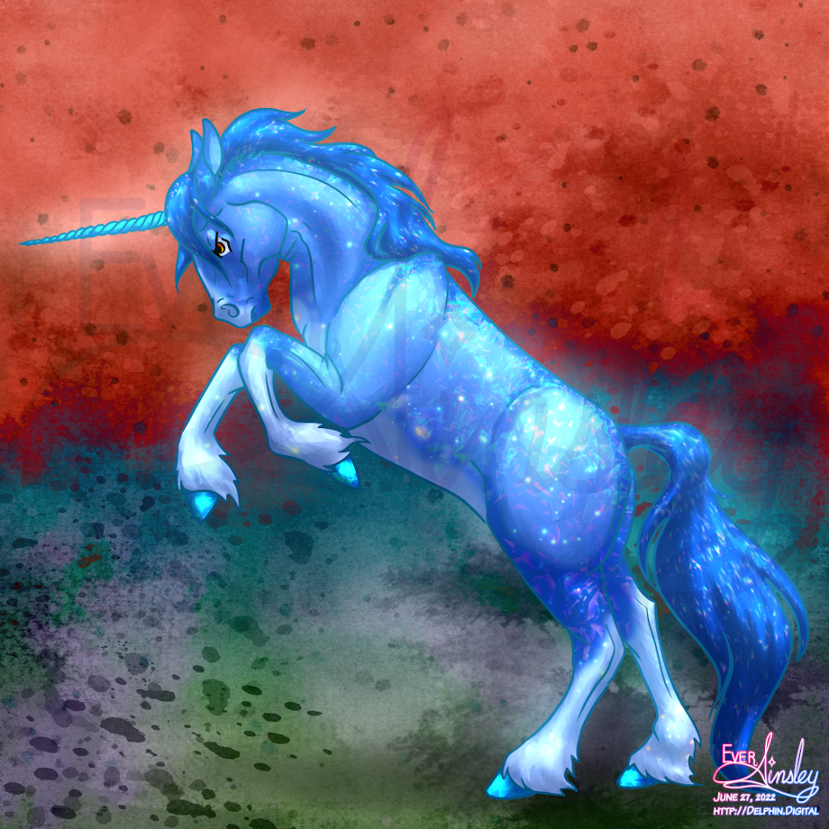 His orignal pose was rearing, so I decided to keep it, and make him a bit more aggro. The background was an accident as I was toying around with textures, but liked it, so it stuck.