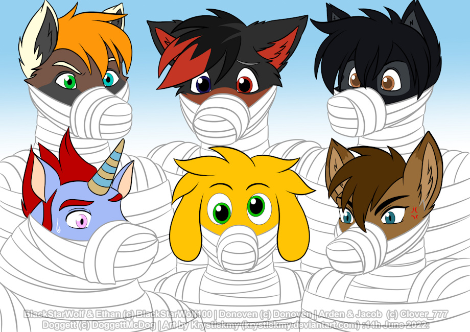 So me and My friends, Donoven, Doggett, Ethan, Jacob, and Arden are all Mummified Alive. We’ve been each wrapped up nice and tight from our feet to our necks. We also have bandages wrapped around our mouths and noses.