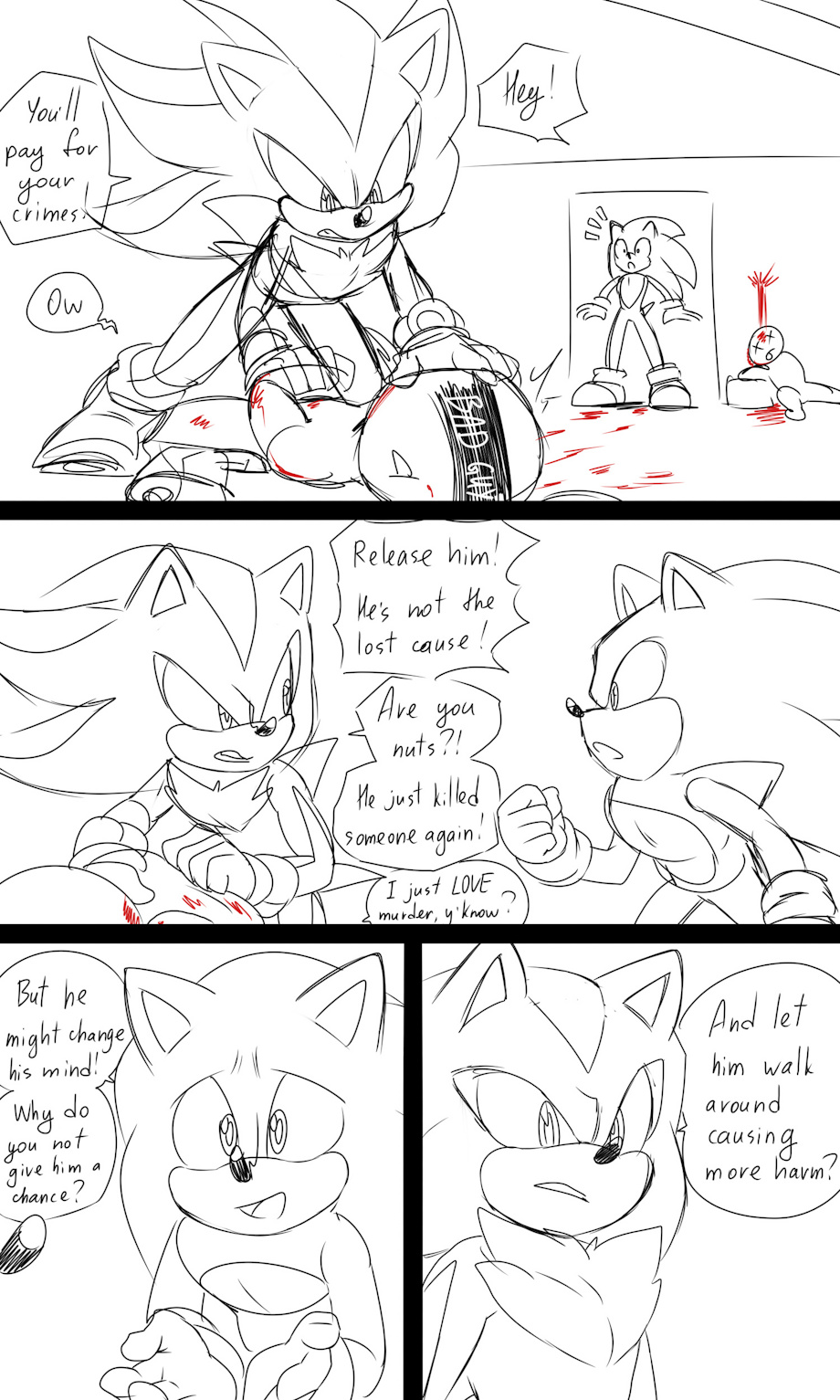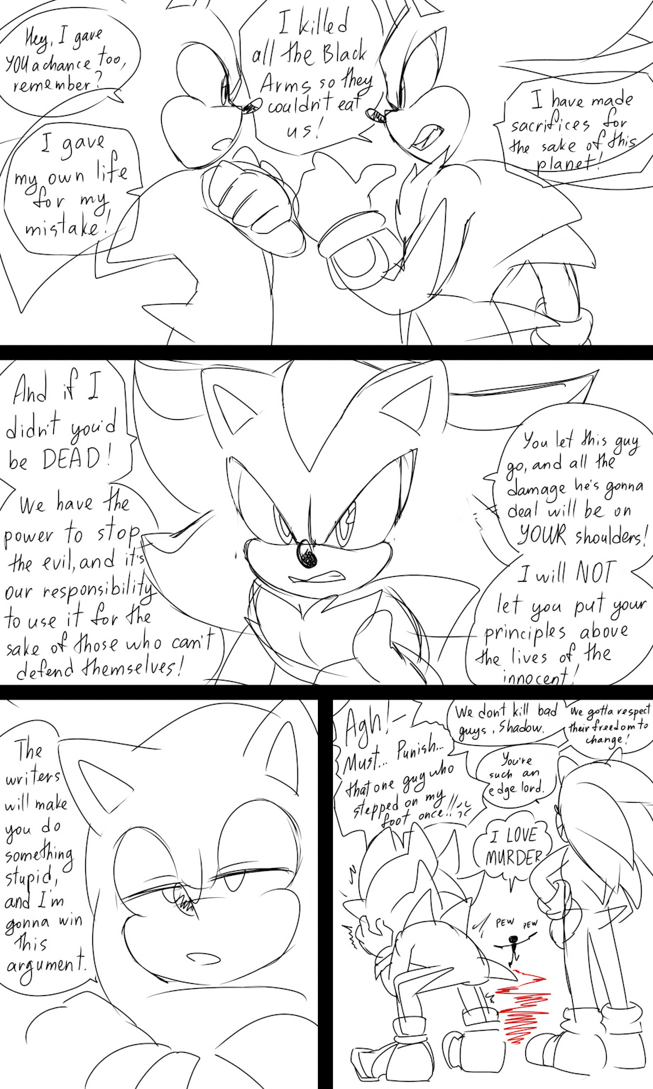 Sonic, for the most part, is VERY forgiving in nature, look at most of his friends, they all tried to kill him, or otherwise harm him. He likewise has faith in his legal system, though he did forgive an amnesiac Eggman, who honestly did look like he was turning a new leaf without his madness. Besides Sonic isn't a killer, Shadow is 100% and you are spot on about the writers with him and his arguments with sonic.