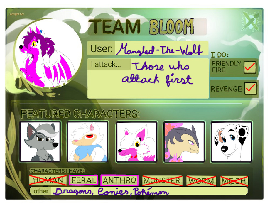No voy a participar en el ArtFight del Team Bloom vs Wither jejejeh, soy en realidad un espectador pero si tuviera que participar usaría a esos seis personajes que ustedes están viendo: Dragon Mangled, Gasuketto Hasuki, Wind The CoyWolf, FunTime Foxy Jr., Tyler The H.Typhlosion y por supuesto Delliah Dalmatian.