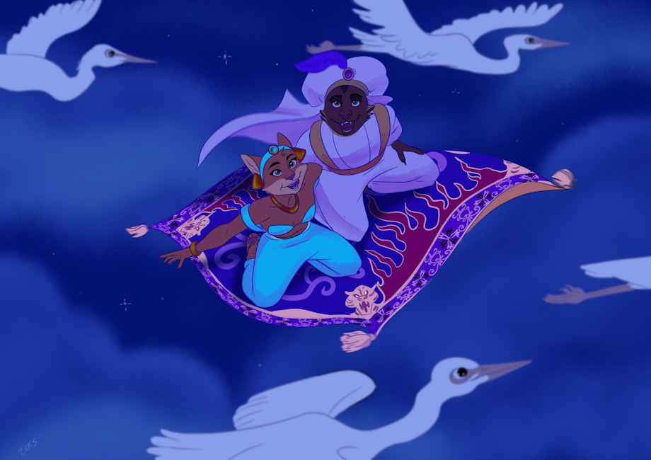 Shameen and Princess Shema going for a ride on a magical carpet, in a land not unlike their native Shapier...